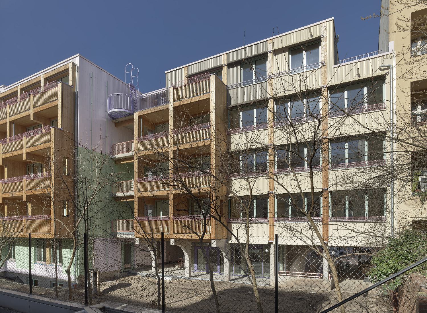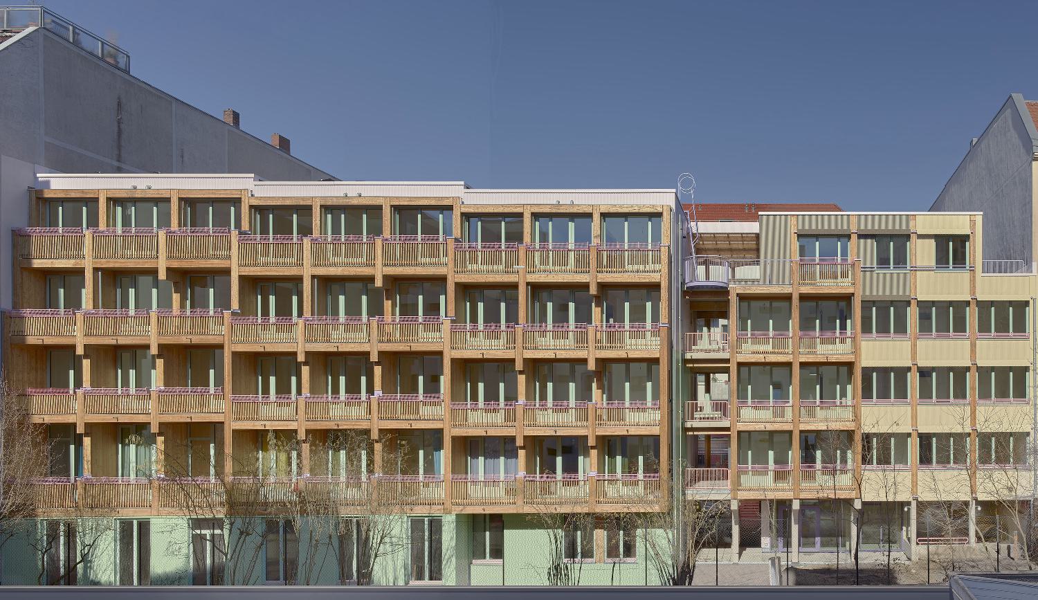 Das DGNB zertifizierte Haus ist ab OK Erdgeschoss tragend komplett aus Holz errichtet. Eine Besonderheit stellt die Erschliessung dar, die ausschließlich über seitlich offene Laubengänge erfolgt, die sich zwischen zwei Treppenhäusern aufspannen. Zum ersten Mal wurden in Deutschland wieder offene Laubengänge tragend in Holz hergestellt. BSH-Holzstützen tragen einen Diagonalrost aus BSH-Balken. Die Brandwände sind - genauso wie der Aufzugsschacht - in Holzbauweise hergestellt.