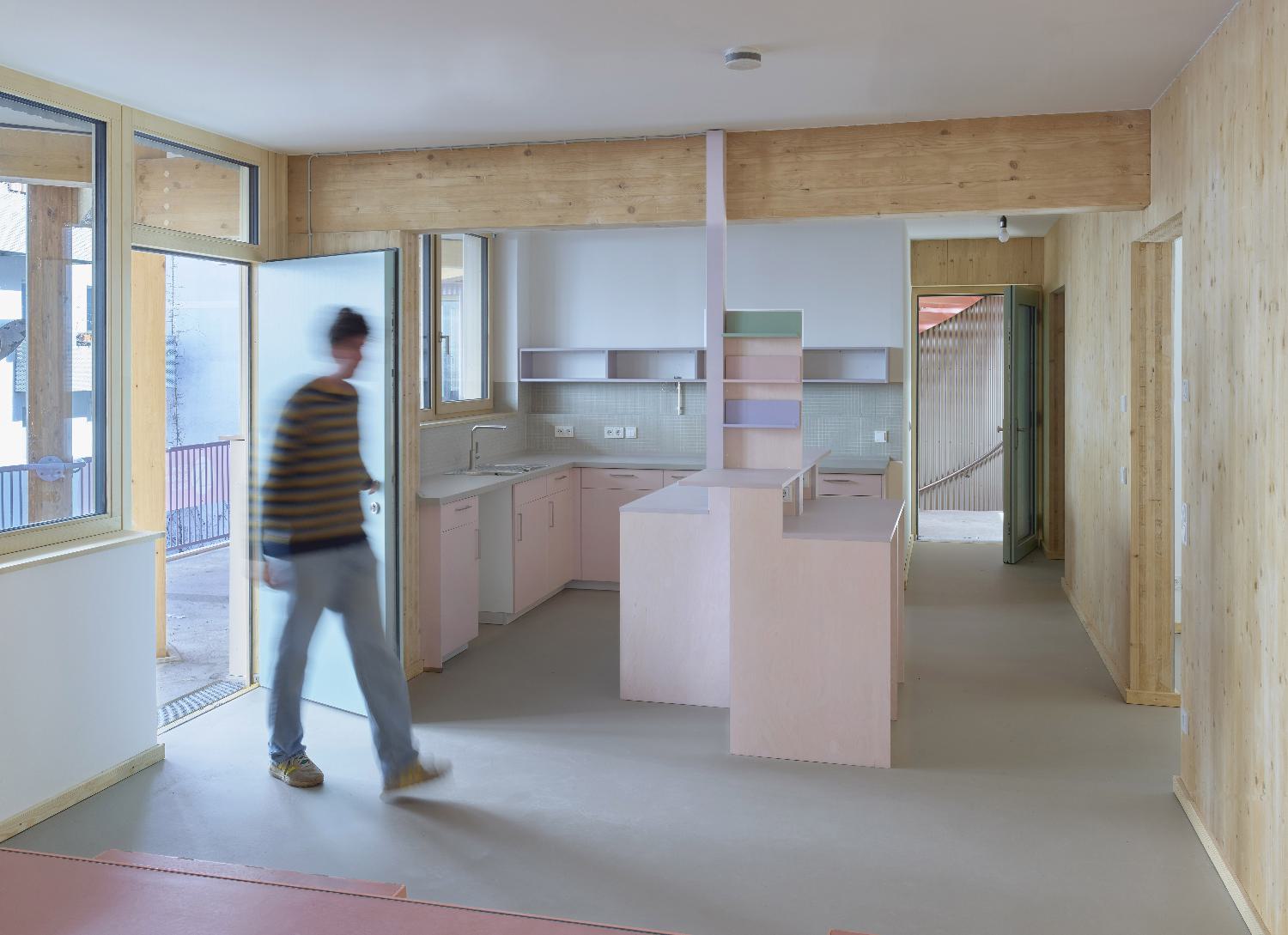 Das DGNB zertifizierte Haus ist ab OK Erdgeschoss tragend komplett aus Holz errichtet. Eine Besonderheit stellt die Erschliessung dar, die ausschließlich über seitlich offene Laubengänge erfolgt, die sich zwischen zwei Treppenhäusern aufspannen. Zum ersten Mal wurden in Deutschland wieder offene Laubengänge tragend in Holz hergestellt. BSH-Holzstützen tragen einen Diagonalrost aus BSH-Balken. Die Brandwände sind - genauso wie der Aufzugsschacht - in Holzbauweise hergestellt.